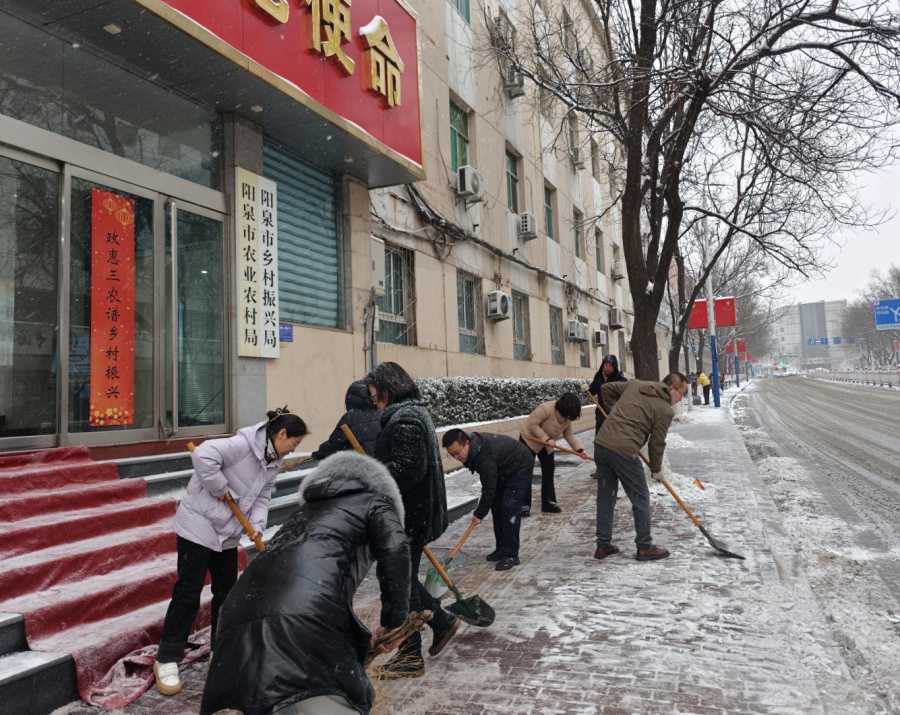 12月12日,阳泉市迎来今冬首场强降雪。银装素裹的美景之下,道路积雪与结冰也给群众出行带来了诸多不便与安全隐患。市农业农村局以雪为令、闻令而动,坚决响应市委市政府号召,深化“双报到”机制,携手观象台社区,组织党员干部迅速开展扫雪除冰联合行动。